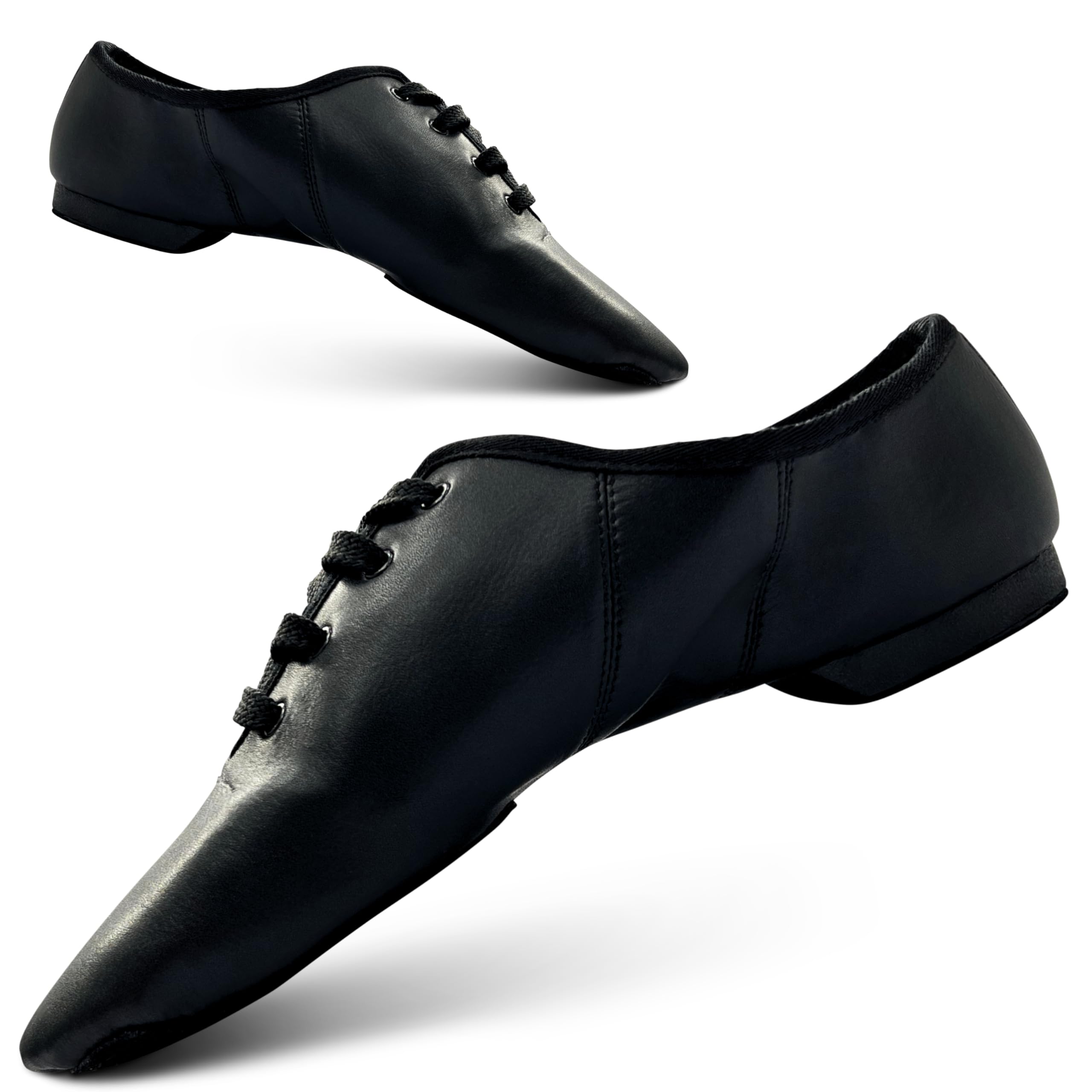 Modern Black Jazz Dance Shoes for Girls - Leather Lace Up with Suede Split Sole & Rubber Heel | Girls Black Jazz Dance